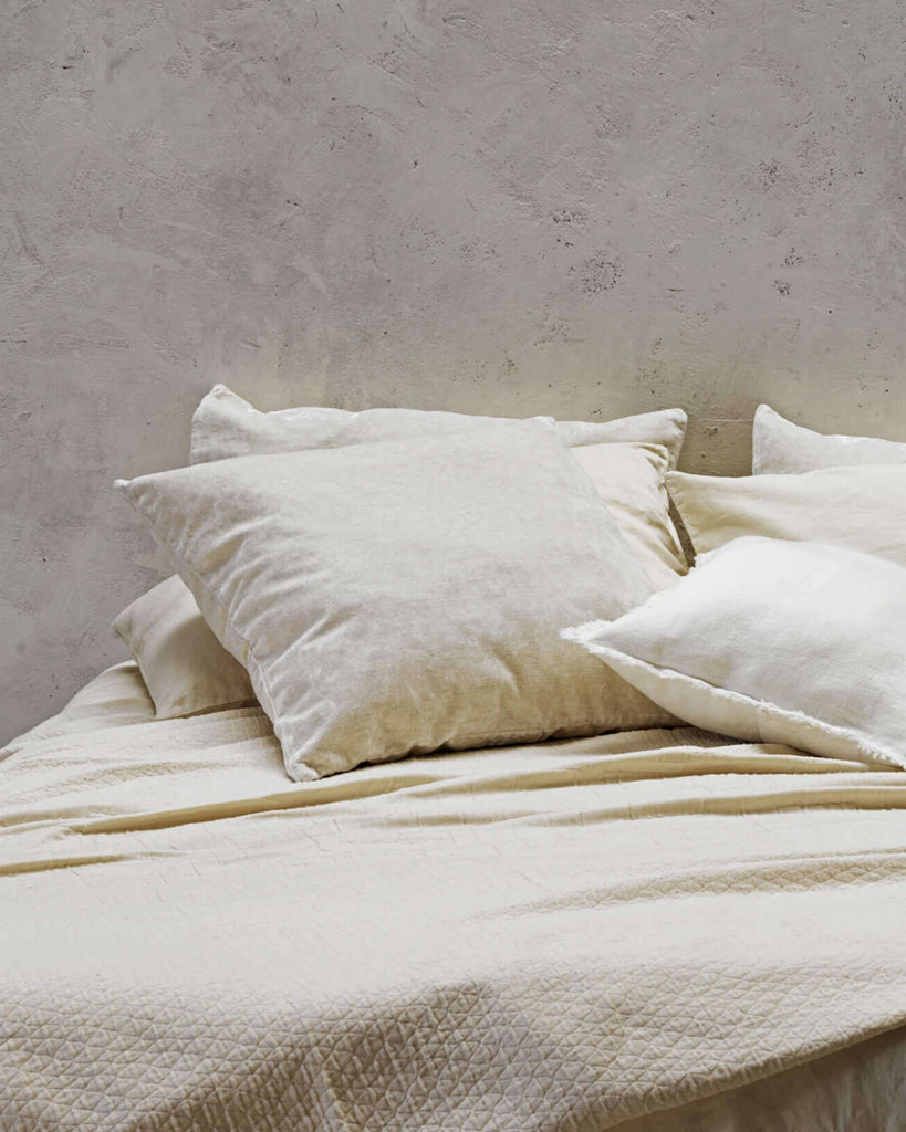 These pillowcases are made of velvet which is highly sensual and experimental. It is woven with Linen, giving the velvet an ultra-soft touch and movement accented by our artisanal dye process. The result is a beautifully distressed and unique color. These pillows come in 6 different sizes and are perfectly paired with our Heritage sheets to accent your bed or as comfortable and decorative pillows to adorn your sacred spaces.