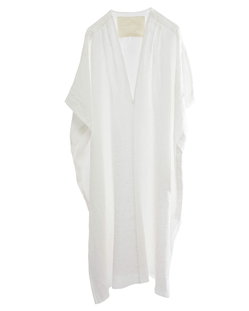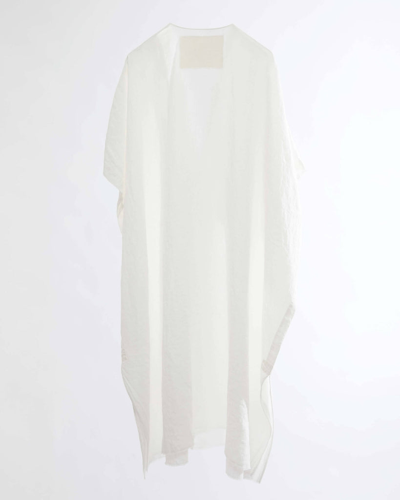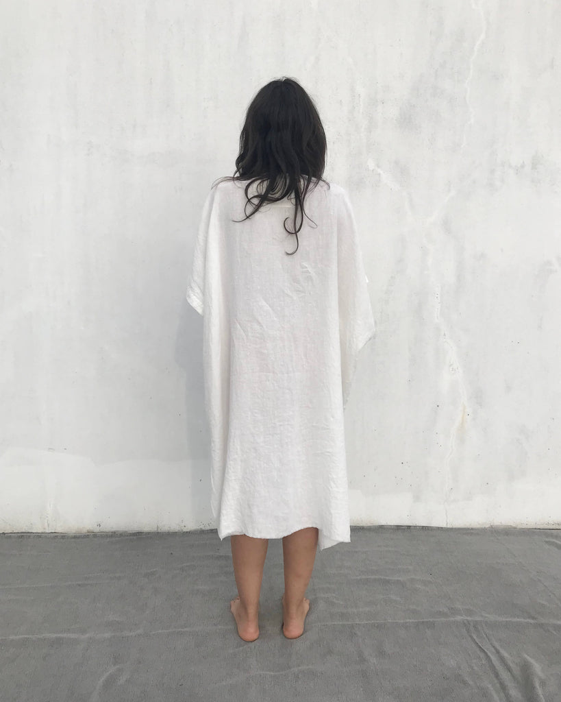 The short kaftan in fine washed linen is breathable, cool and practical. This kaftan is fluid with the perfect amount of casual imperfection and offers more coverage for those who prefer it. This linen is designed to age with you, and the more it is washed and loved, the softer it will get. The hemline is a careful raw edge and there is a pleat at the neckline. All our garments are designed to be timeless and worn year-round, wear this dress as your favourite go-to on hot summer days or to lounge at home anytime you want.