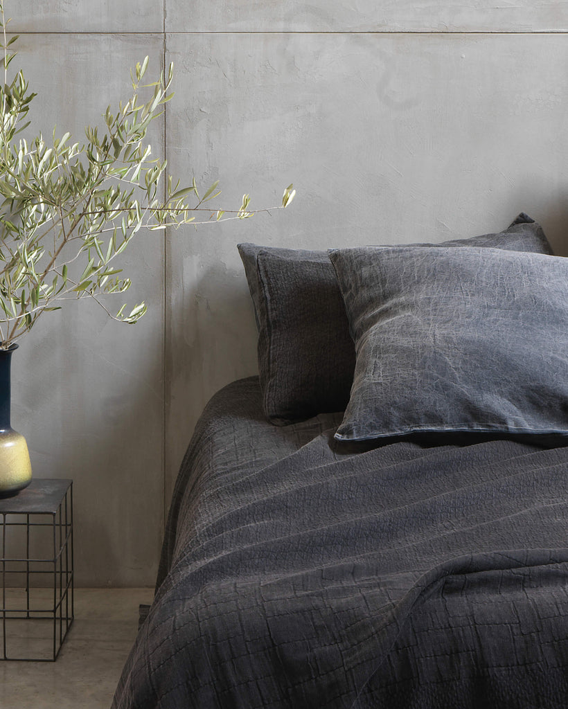 Here Linen and Cotton are woven in a unique double jacquard weave by an artisanal weaver in Treviso, Italy. There are large alternating strips of two different patterns going across this medium-weight fabric. Each pillowcase is slightly different depending on where the pattern falls making your bed unique and one of a kind. The result is an exceptionally healthy, breathable, soft and tactile experience that just begs to be relaxed on.